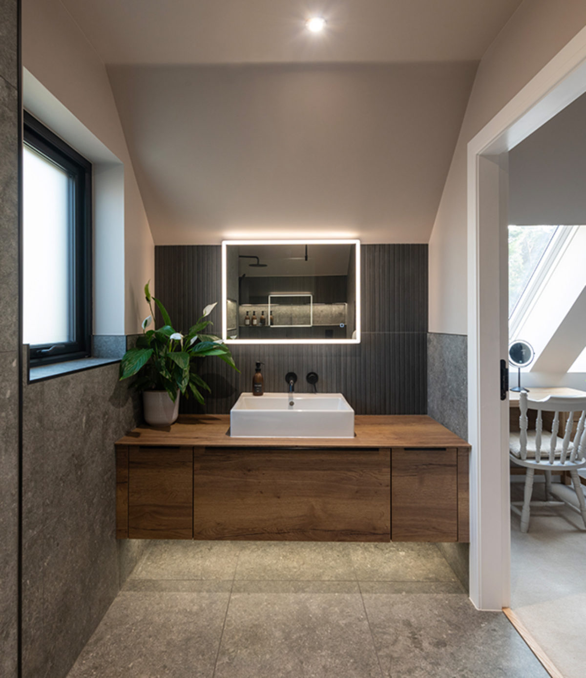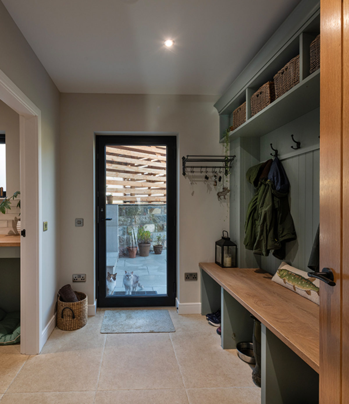 Sustainability is integral, with high-performance insulation, airtightness, efficient glazing, MVHR, solar PV, solar thermal and an air-source heat pump delivering low-carbon heating. The result is a finely crafted home that blends vernacular character with contemporary design, closely connected to its landscape.